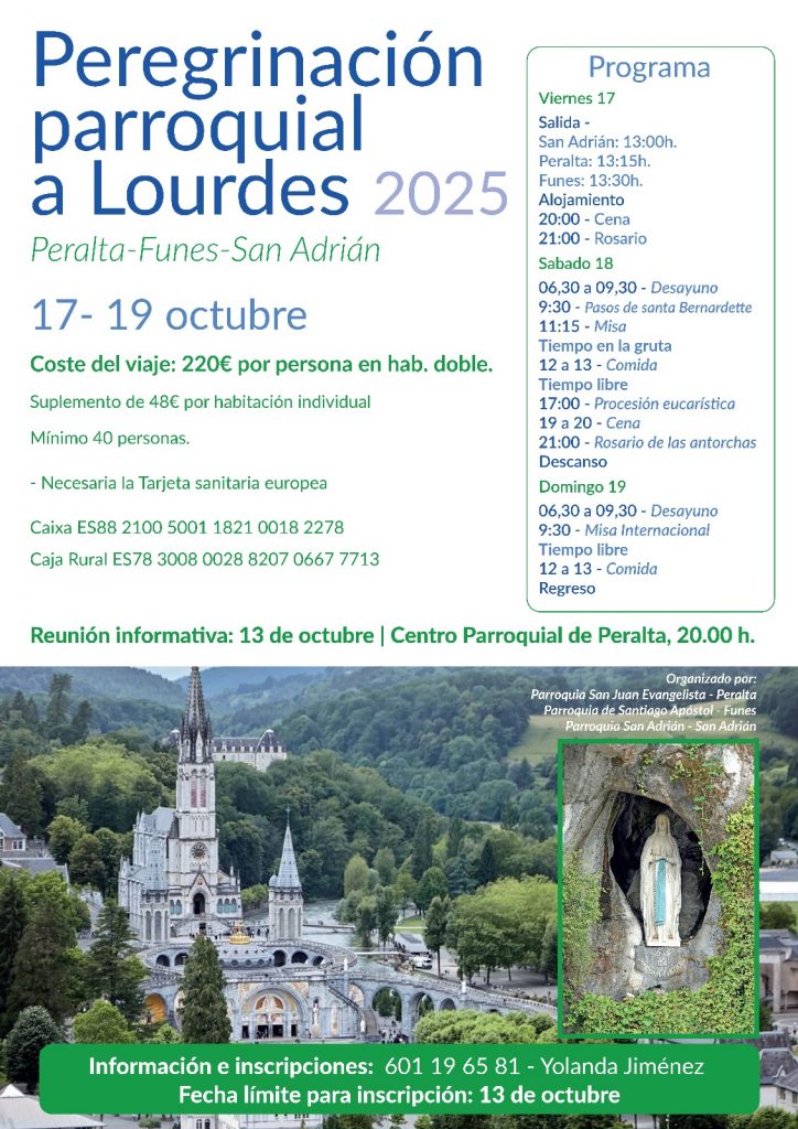 Un año más, desde la Parroquia organizamos esta Peregrinación a Lourdes del viernes 17 al domingo 19 de octubre. En casa de nuestra Madre estamos muy bien. Conoce los lugares de Santa Bernardette, la procesión eucarística con los enfermos, el Rosario de las antorchas por la noche… y muchas cosas más. Anímate. No te arrepentirás. Toda la información en el cartel.